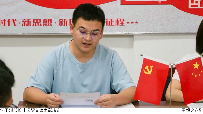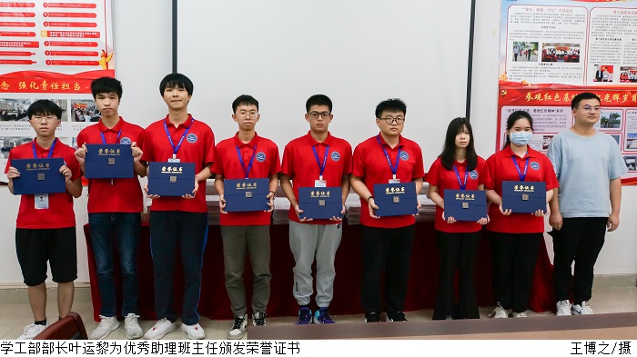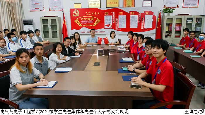 叶运黎宣读了《关于表彰2021-2022学年度2021级学生先进集体和先进个人的决定》,21本科电信1班、21本科电信2班、21本科电气3班获得“优秀班集体”荣誉称号,21本科电气1班谢辉鸿等12名学生干部获得“优秀班干部”荣誉称号,梁春铭等8名助理班主任获得“优秀助理班主任”荣誉称号。
