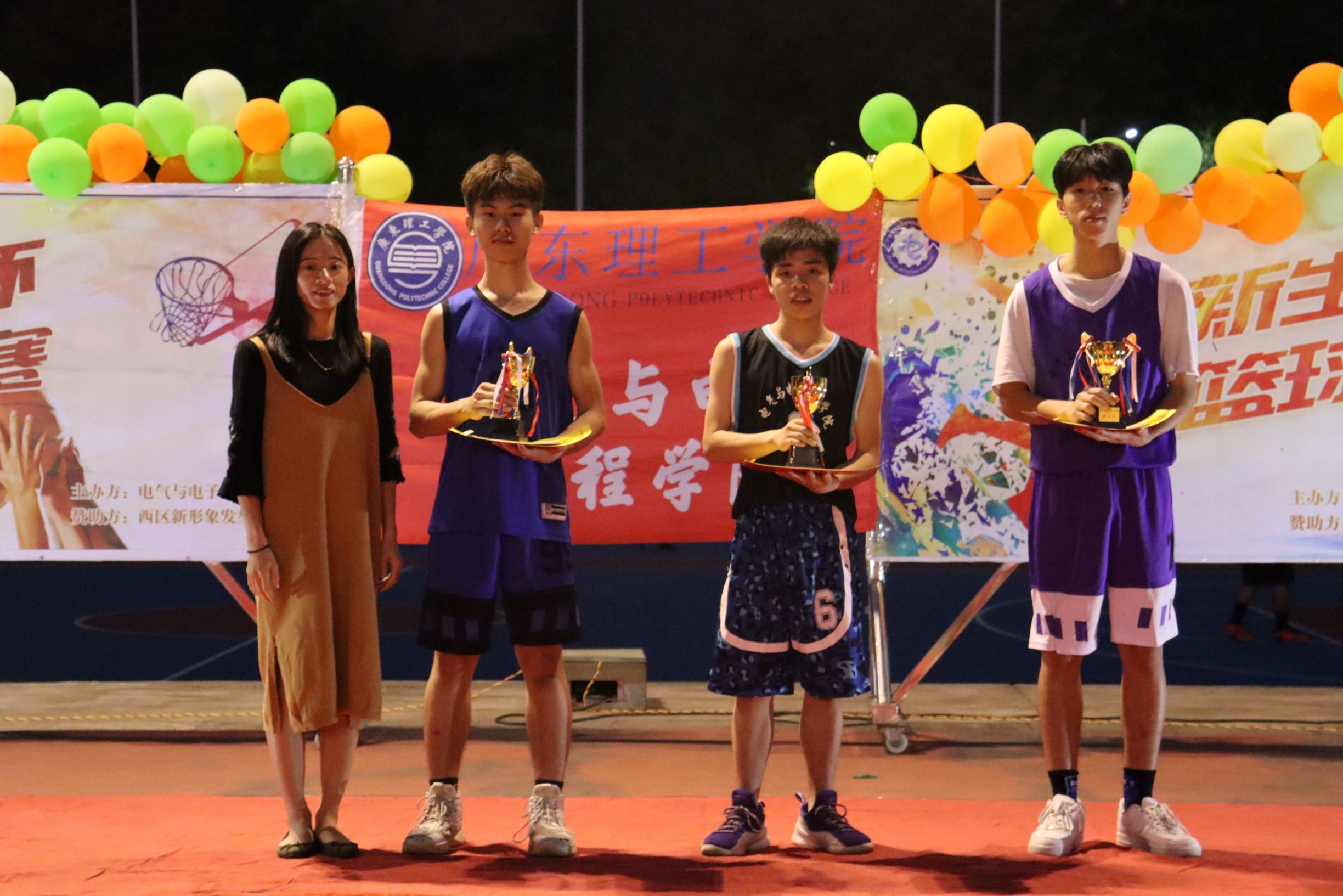 比赛结束后,闭幕式正式开始。首先进行的是颁奖环节,主持人分别宣读了获得优秀裁判奖、三分赛冠军以及各班级最有价值球员奖的人员名单。随后获奖人员先后上台,由郑泽田老师、蔡瑞菁老师、学院分团委叶家宜书记分别为他们颁奖并合影留念。接着主持人宣布了荣获本次“新生杯”篮球赛道德风尚奖和冠亚季军的获奖班级,由学生党支部何娟书记和党总支陈强副书记为他们颁奖并合影留念。最后,主持人宣读了获得本次“新生杯”篮球赛总决赛最有价值球员奖的选手名单,由党总支陈强副书记为他颁奖并合影留念。