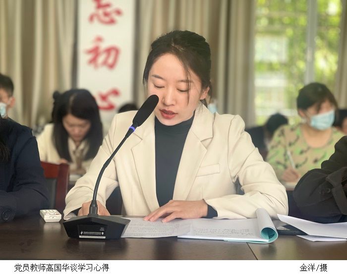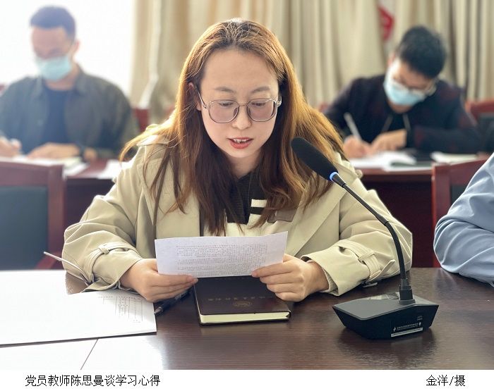 陈思曼、金洋、黄偲钰、高国华四位党员教师分别谈学习心得。他们表示,作为一名党员、一名教育工作者,要不断深化对党的二十大报告进行学习,按照报告指引的方向贡献自身力量。立足本职工作,努力做好青年学生工作,做青年朋友的知心人、青年工作的热心人、青年群众的引路人,使他们能在党的初心使命感召下,立志做有理想、敢担当、能吃苦、肯奋斗的新时代好青年。