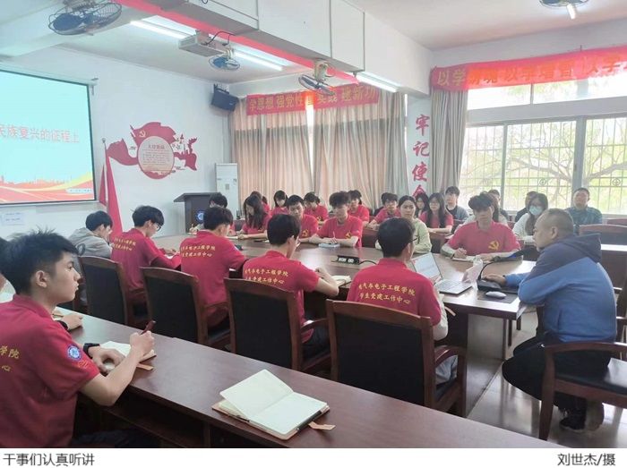 本网讯(永利集团3044欢迎你学生党建工作中心 柯棋哲)3月21日中午,永利集团3044欢迎你党总支陈文华书记在7栋203室以“把青春播撒在民族复兴的征程上”为主题,为学生干部代表授课。
