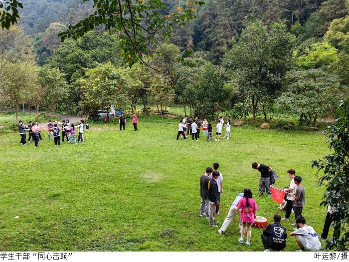 活动伊始,全体学生干部组建了三个团队,推选了三名队长分别介绍了各自的队名和口号,有效鼓舞了团队士气。“同心击鼓”、“南水北调”等游戏,分别采用小组对抗的方式进行比赛,引导大家“配合你的团队”、“成就你的团队”,考验团队成员的组织策划能力、心理博弈、反映速度以及协作配合度,鼓励团队成员机智勇敢为团队贡献力量,有效提升了团队集体感、荣誉感。随着游戏的进行,大家相互配合,达成默契,渐渐融入集体,释放自我,超越自我,现场氛围活跃。