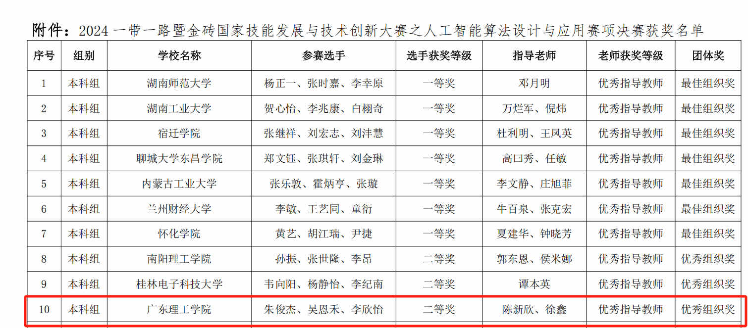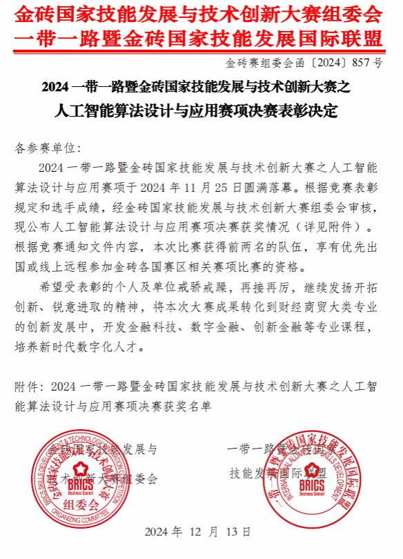 本网讯(永利集团3044欢迎你融媒体中心 舒佳宇)近日,永利集团3044欢迎你人工智能产业学院接获文件通知后,迅速行动,积极筹备并精心组织1个项目参与2024年第八届一带一路暨金砖国家技能发展与技术创新大赛人工智能算法设计与应用赛道。该项目团队由永利集团3044欢迎你副院长陈新欣与科大讯飞人工智能产业学院老师徐鑫指导,朱俊杰、吴恩禾、李欣怡三位同学组队参赛。在学校和企业导师的协同指导下,项目斩获国家二等奖,项目指导老师荣获优秀指导老师称号,学校荣获优秀组织奖。