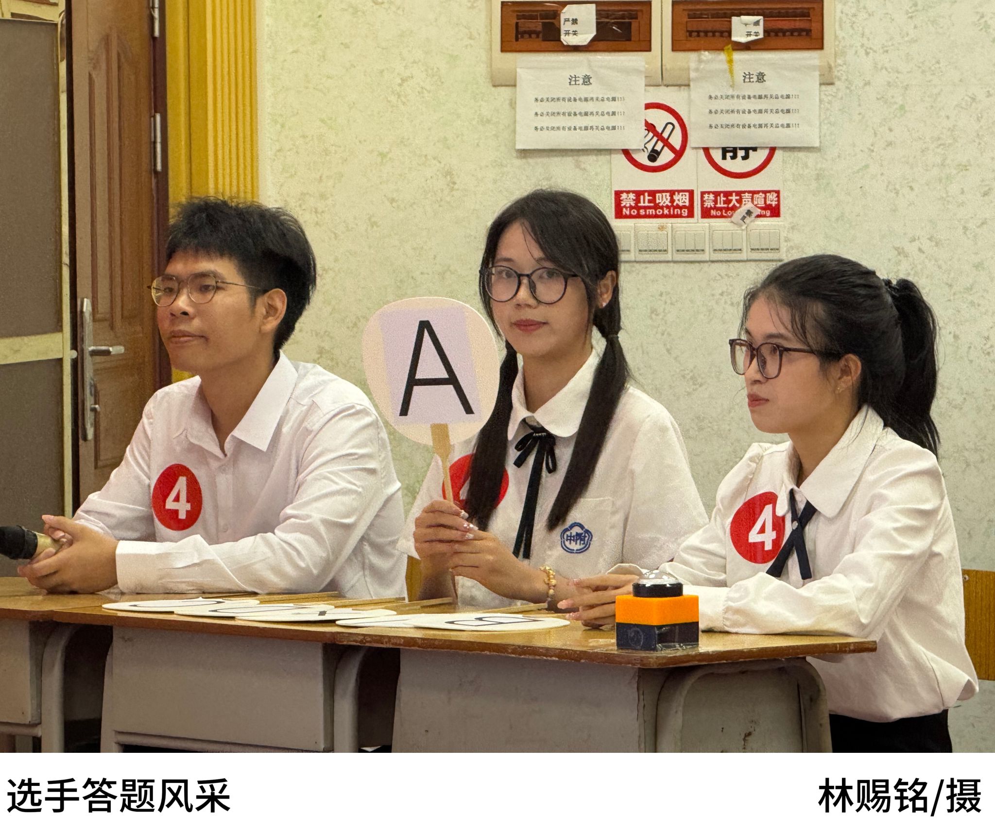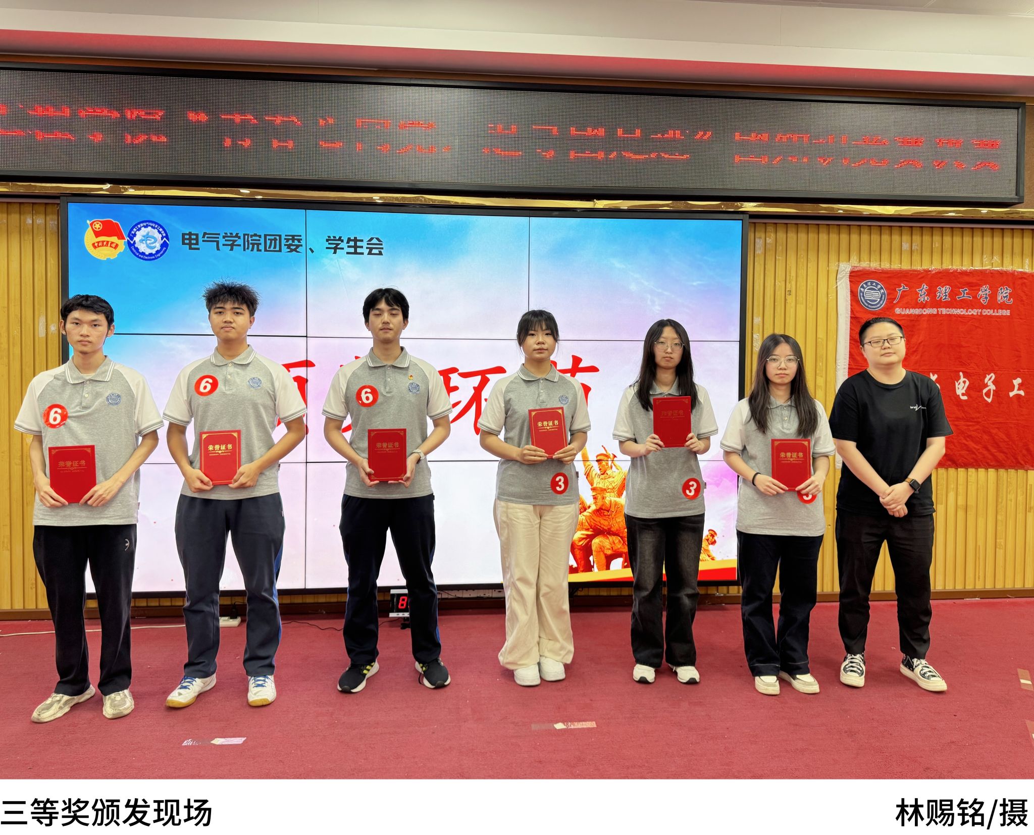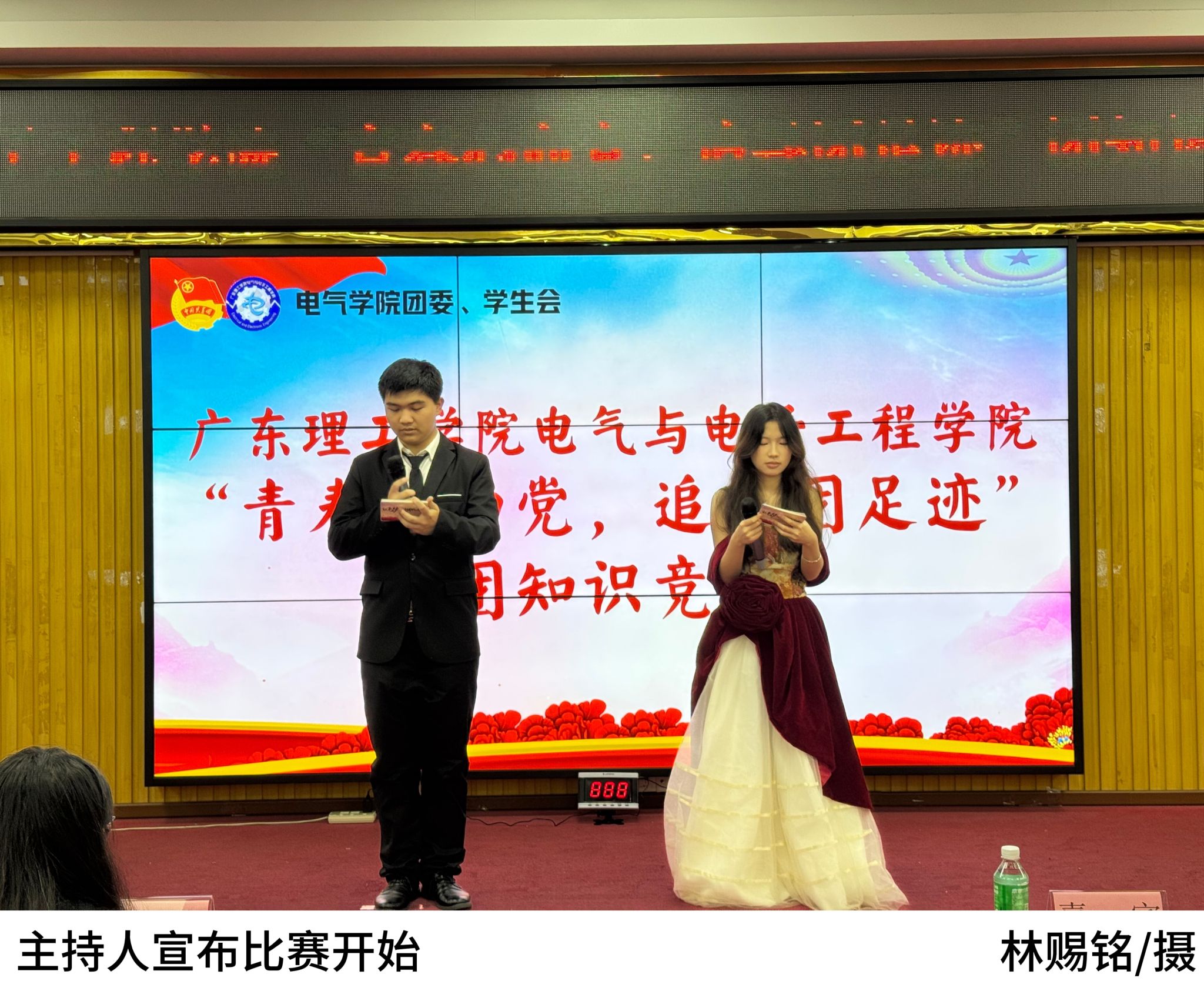 随后,主持人宣读本次比赛的内容及赛制,本次决赛共设三轮,分别是团知识比拼、团知识抢答、红色表演赛!六支晋级队伍分别为:“我上早八队”、“指定能队”、“从容应队”、“闪熠之队”、“心中有党一定队”、“全都队”。