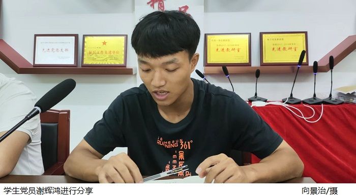 学生党员谢辉鸿以“习近平总书记重要文章《在文化传承发展座谈会上的讲话》”为主题,对中华文化传承发展进行讲解,他强调,身为学生党员应担当使命、奋发有为,共同努力创造属于我们这个时代的新文化,建设中华民族现代文明。