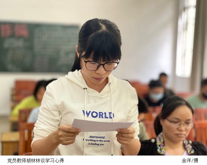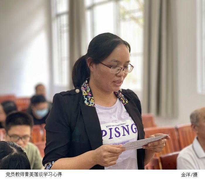 黄美莲、胡林林两名党员教师分别谈学习心得。他们表示,要走在时代发展前沿,不断充实、拓展、提高自身业务能力,承担起为祖国培育栋梁的重任,为党育人、为国育才,用高质量的课堂培育引导学生,努力将中华优秀传统文化中蕴含的思想观念、人文精神、道德规范等文化精髓融入到学生生活中,让学生成为中华优秀传统文化的继承者、守护者、传播者和创新者。