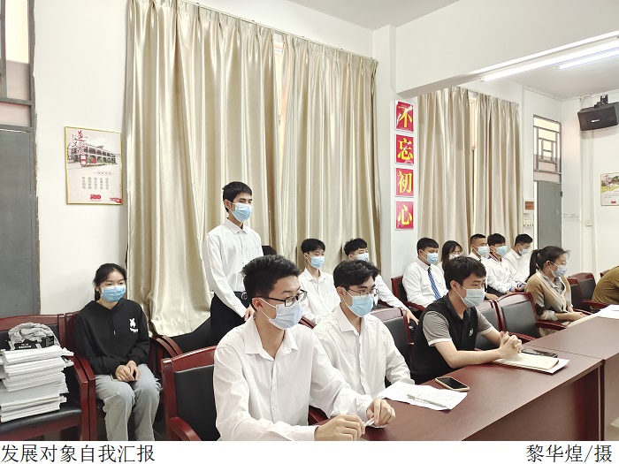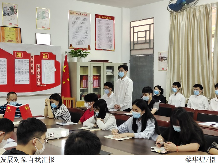 会上,通过发展对象向党组织汇报了对党的认识、入党动机、本人履历、家庭和主要社会关系情况,以及需向党组织说明的问题,入党介绍人对其能否入党、本人是否同意加入党组织表明意见和态度。学生党支部组织委员叶家宜代表支委会汇报了政审情况以及他们的现实表现和培养考察情况。