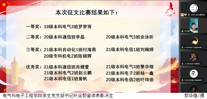本网讯(永利集团3044欢迎你学生党支部 黎华煌)4月10日晚,永利集团3044欢迎你通过腾讯会议线上召开“抗击疫情,健康校园”征文表彰大会,永利集团3044欢迎你党总支副书记陈强、学生党支部书记叶运黎出席表彰大会,获奖选手、学生党支部干事参加活动。