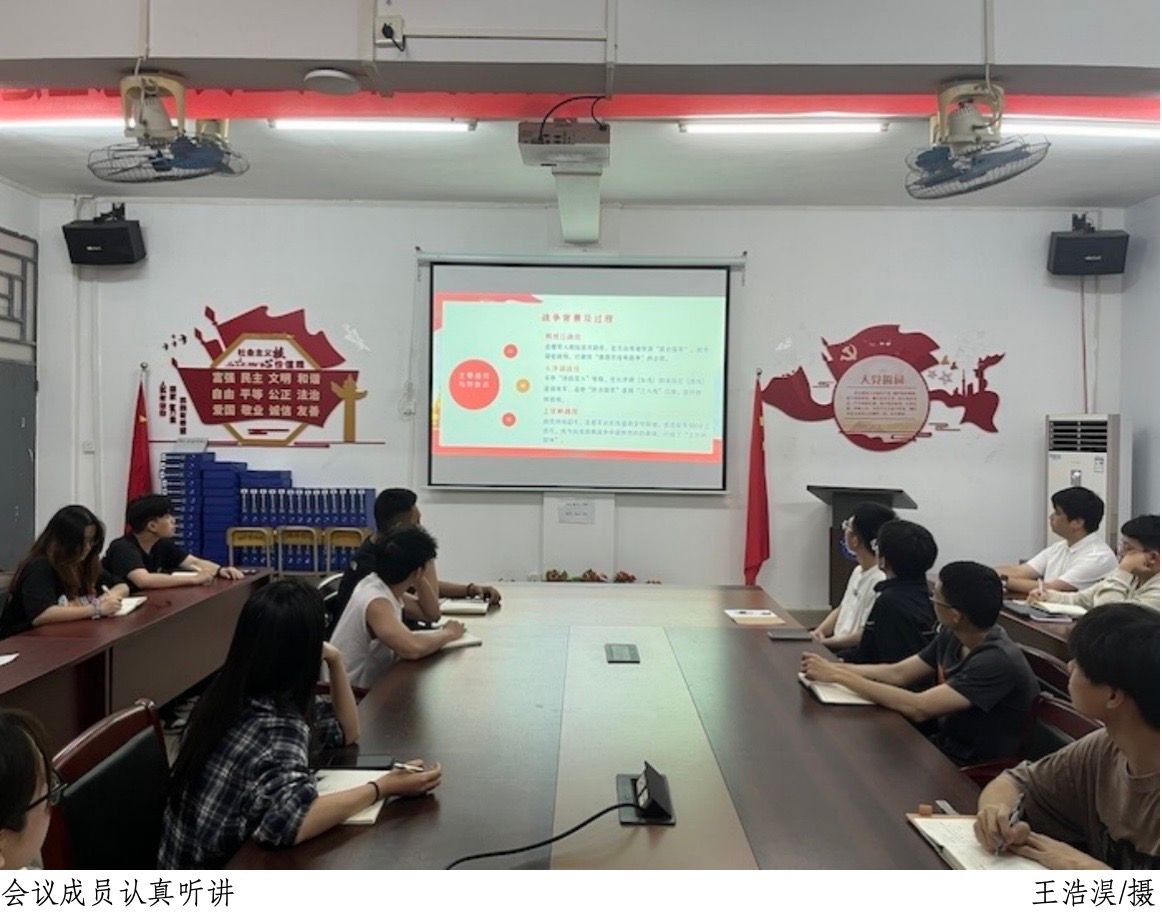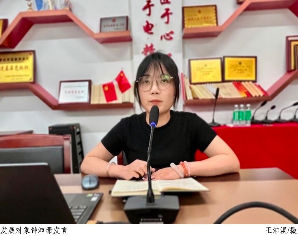 会上,发展对象钟沛珊以“中国人民志愿军抗美援朝作战75周年”为题,讲解了抗美援朝战争的历史意义和伟大精神。她通过分析长津湖、上甘岭等经典战役和黄继光、邱少云等英雄事迹,深刻阐释了爱国主义、革命英雄主义和国际主义精神的时代价值。钟沛珊谈到,要以革命先烈为榜样,传承红色基因,坚定理想信念、勇担责任使命,深刻领会伟大抗美援朝精神的现实意义。